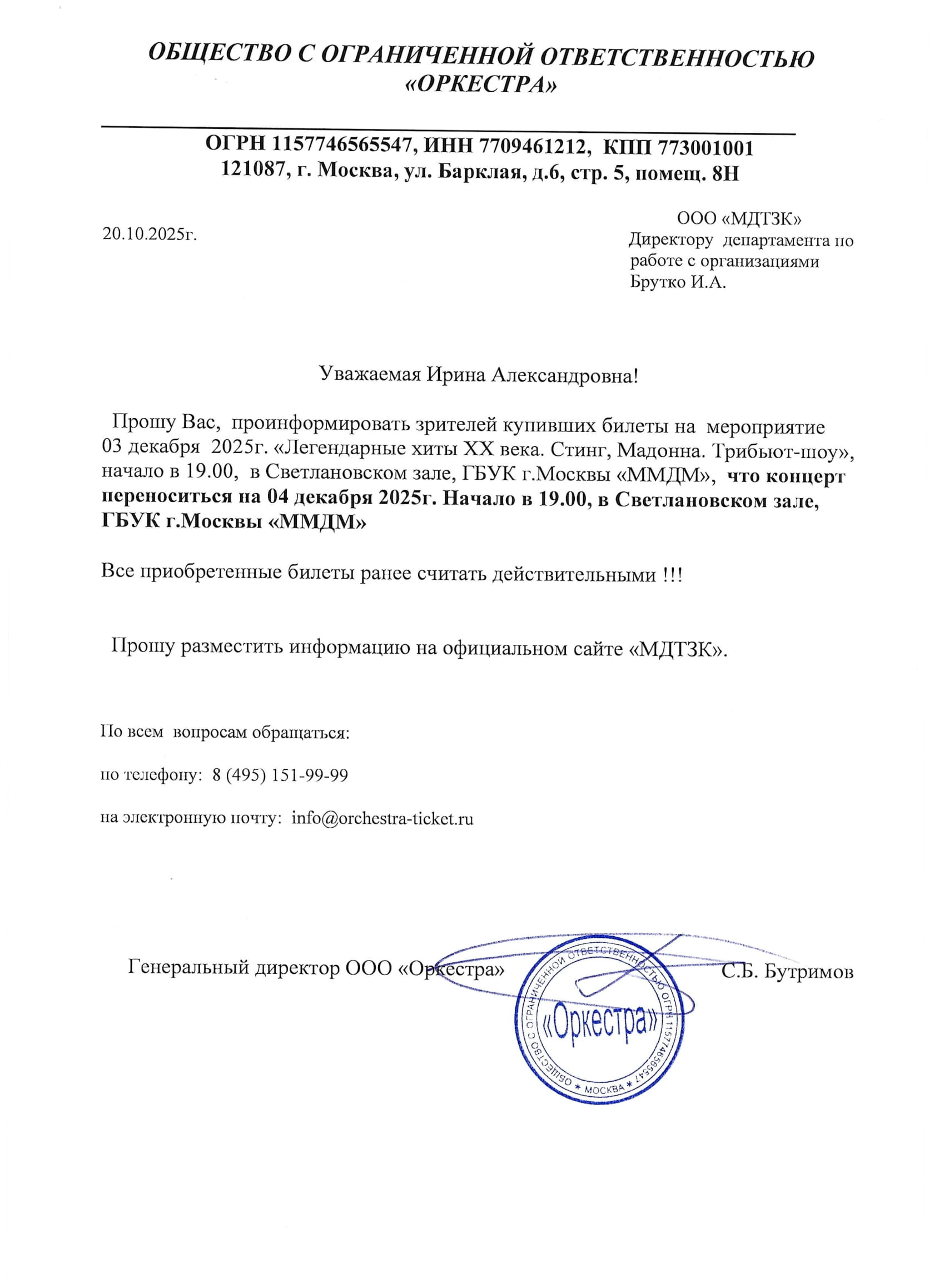 Уважаемый клиент! Спешим сообщить, что по информации, полученной от организатора, Трибьют-шоу «Легендарные хиты ХХ века. Стинг, Мадонна», запланированное на 3 декабря 2025 года в 19:00 Доме музыки, перенесено на 4 декабря 2025 года, начало в 19:00. Ранее приобретенные билеты действительны на новую дату, обменивать их не нужно. По всем вопросам обращайтесь, пожалуйста, к организатору мероприятия по номеру телефона: +7 (495) 151-99-99 или по электронной почте: info@orchestra-ticket.ru. С уважением, команда поддержки Ticketland.
