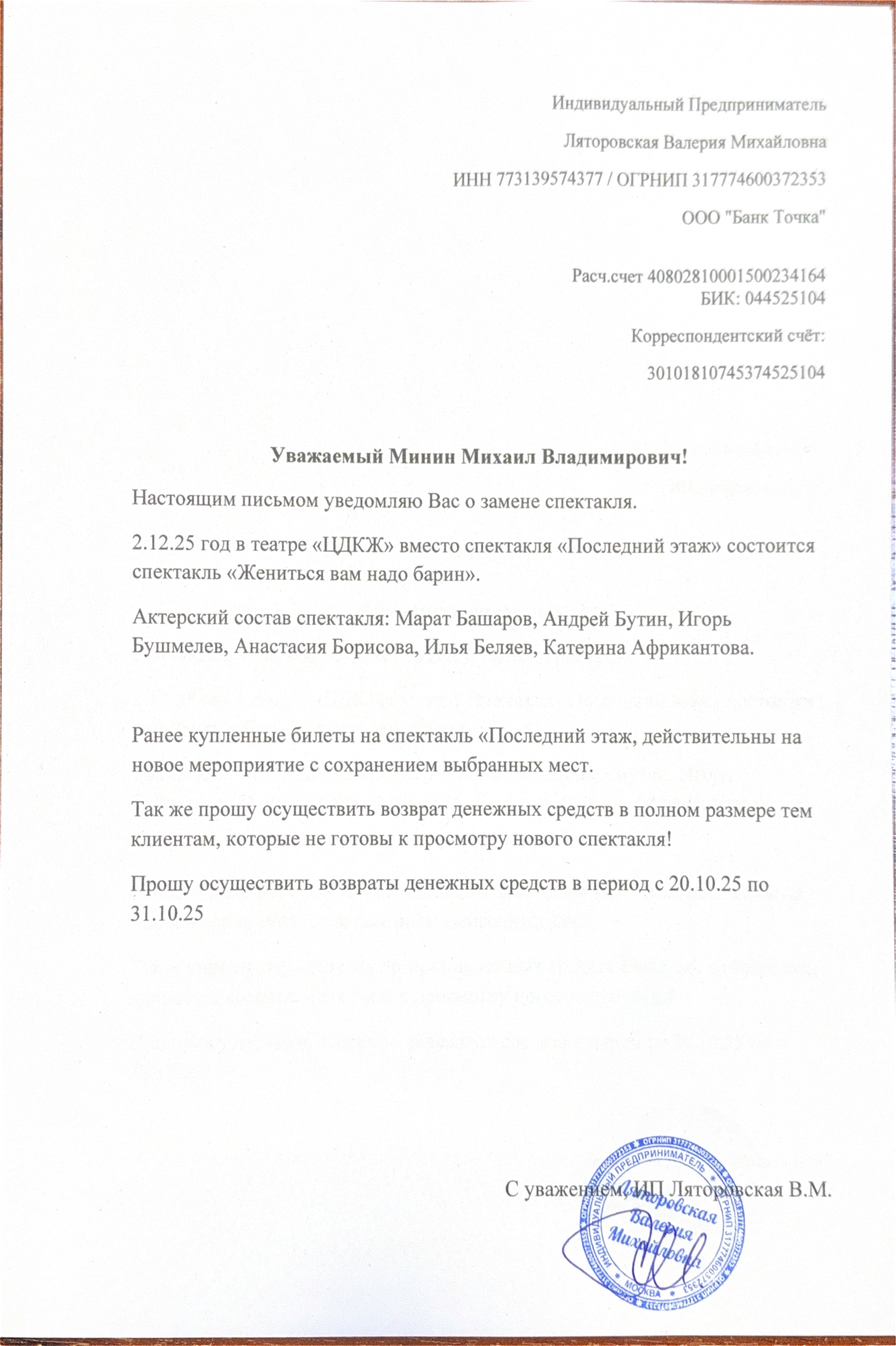 Уважаемый клиент! Спешим сообщить, что по информации, полученной от организатора, спектакль «Толстушка в тренде», запланированный на 19 октября 2025 года в 14:00 в мастерской на Кулишках, отменён. Деньги за электронные билеты вернутся автоматически в полном объёме на карту, с которой была произведена оплата. Если вы купили билет в кассе Ticketland.ru за наличный расчет, то обратитесь, пожалуйста, на почту: vozvrat@ticketland.ru. Письмо от организатораС уважением, команда поддержки Ticketland.