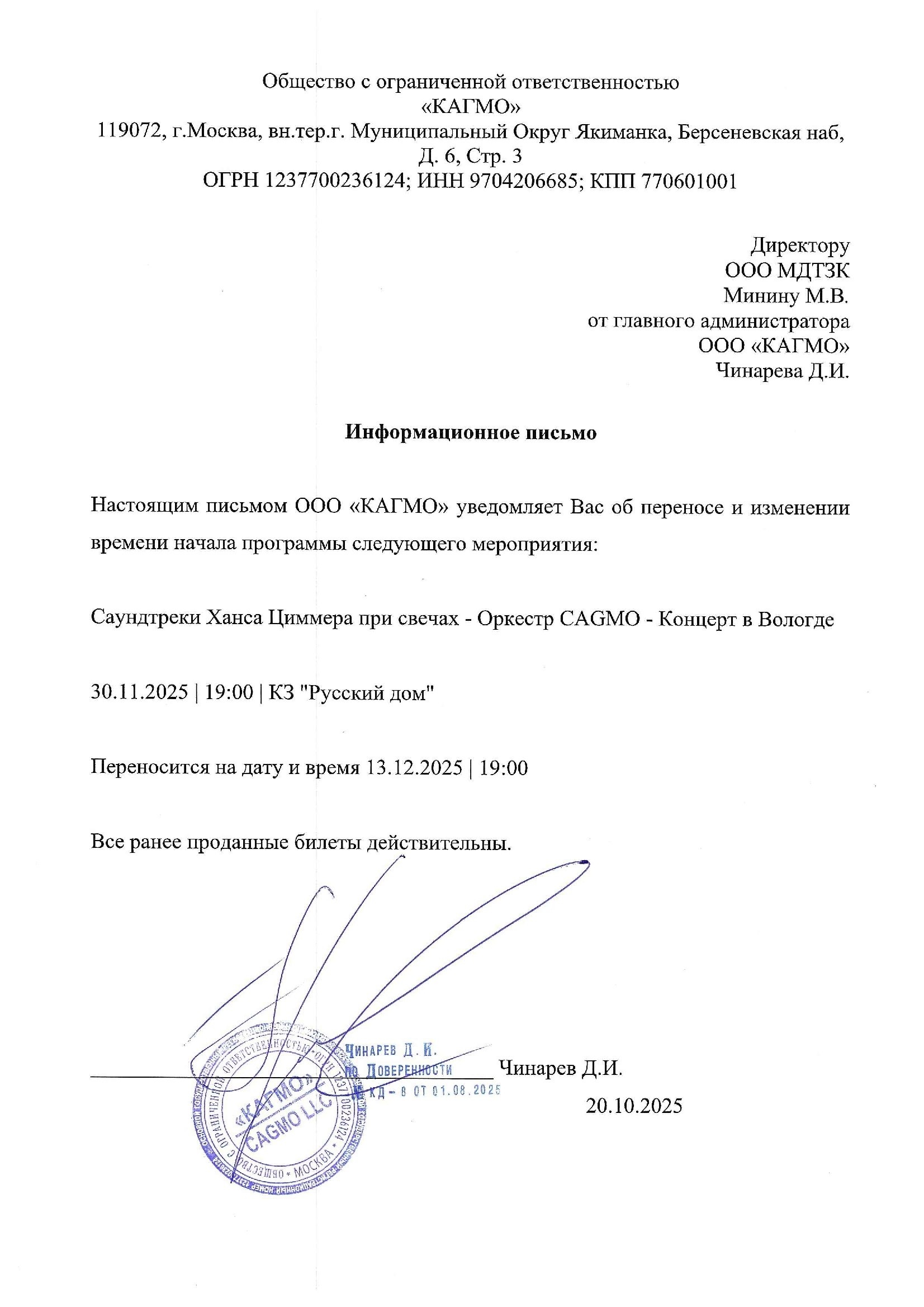 Уважаемый клиент! Спешим сообщить, что по информации, полученной от организатора, концерт «Оркестр CAGMO – Саундтреки Ханса Циммера при свечах», запланированный на 30 ноября 2025 года в 19:00 в КЗ «Русский дом», перенесён на 13 декабря 2025 года, начало в 19:00. Ранее приобретенные билеты действительны на новую дату, обменивать их не нужно. Если вам не удобно посетить спектакль в новую дату, вы можете вернуть билет по кнопке в личном кабинете во вкладке «Заказы». Деньги за электронные билеты вернутся автоматически в полном объёме на карту, с которой была произведена оплата. Если вы купили билет в кассе Ticketland.ru за наличный расчет, то обратитесь, пожалуйста, на почту: vozvrat@ticketland.ru. Письмо от организатораС уважением, команда поддержки Ticketland.
