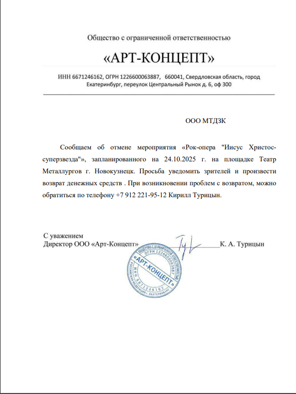 Уважаемый клиент! Спешим сообщить, что по информации, полученной от организатора, рок-опера «Иисус Христос – суперзвезда», запланированная на 24.10.2025 в 19:00 в Театре Металлургов, отменена. Деньги за электронные билеты вернутся автоматически в полном объёме на карту, с которой была произведена оплата. Если вы купили билет в кассе Ticketland.ru за наличный расчет, то обратитесь, пожалуйста, на почту: vozvrat@ticketland.ru. С уважением, команда поддержки Ticketland