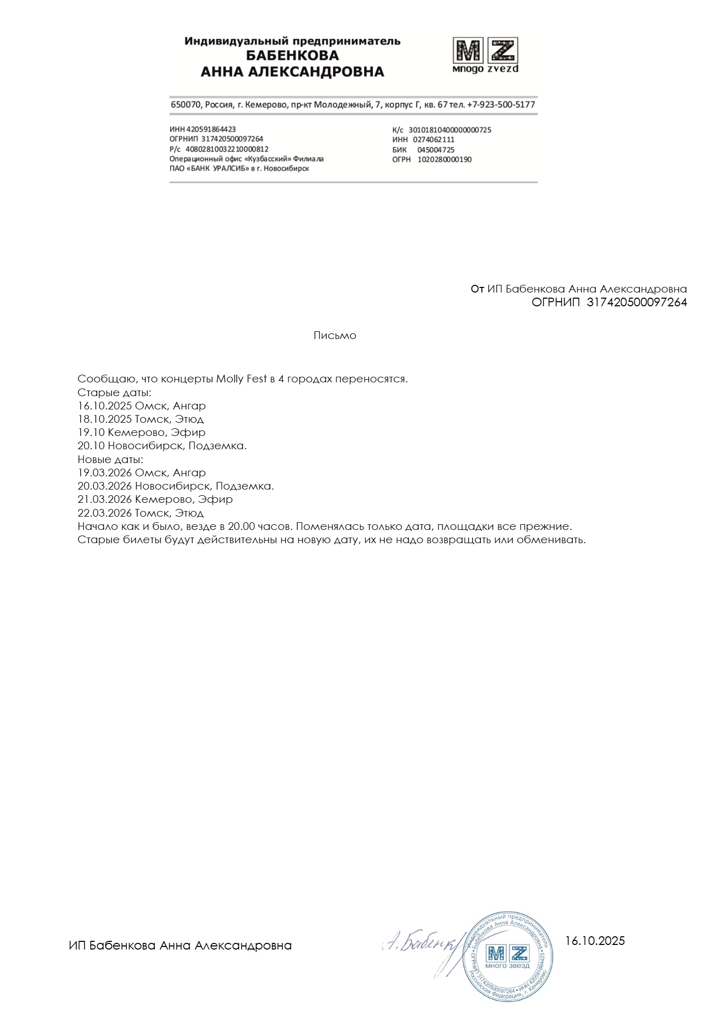 Уважаемый клиент! Спешим сообщить, что по информации, полученной от организатора, фестиваль «Molly Fest», запланированный на 20 октября 2025 года в Лофт-парке «Подземка», перенесён на 20 марта 2026 года, начало в 20:00. Ранее приобретенные билеты действительны на новую дату, обменивать их не нужно. Если вам не удобно посетить спектакль в новую дату, вы можете вернуть билет по кнопке в личном кабинете во вкладке «Заказы» (до 20.11.25, включительно). Деньги за электронные билеты вернутся автоматически в полном объёме на карту, с которой была произведена оплата. Если вы купили билет в кассе Ticketland.ru за наличный расчет, то обратитесь, пожалуйста, на почту: vozvrat@ticketland.ru. С уважением, команда поддержки Ticketland.