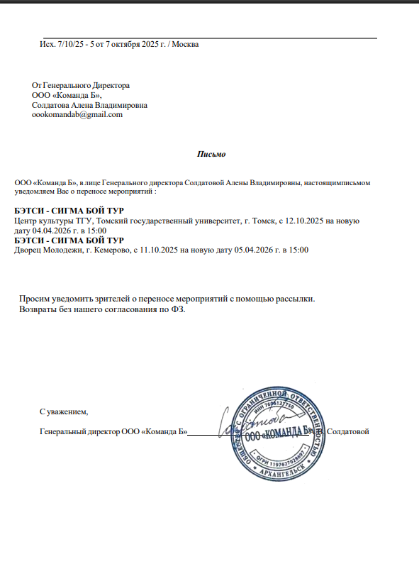 Уважаемый клиент! Спешим сообщить, что по информации, полученной от организатора, концерт Бэтси «Сигма бой тур», запланированный на 11.10.2025 во Дворце Молодежи, переносится на 05.04.2026 г. в 15:00. Ранее приобретенные билеты действительны на новую дату, обменивать их не нужно. Если вам не удобно посетить концерт, вы можете вернуть билет по кнопке в личном кабинете во вкладке «Заказы» (до 31.10.25 включительно). Деньги за электронные билеты вернутся автоматически в полном объёме на карту, с которой была произведена оплата. Если вы купили билет в кассе Ticketland.ru за наличный расчет, то обратитесь, пожалуйста, на почту: vozvrat@ticketland.ru. С уважением, команда поддержки Ticketland.