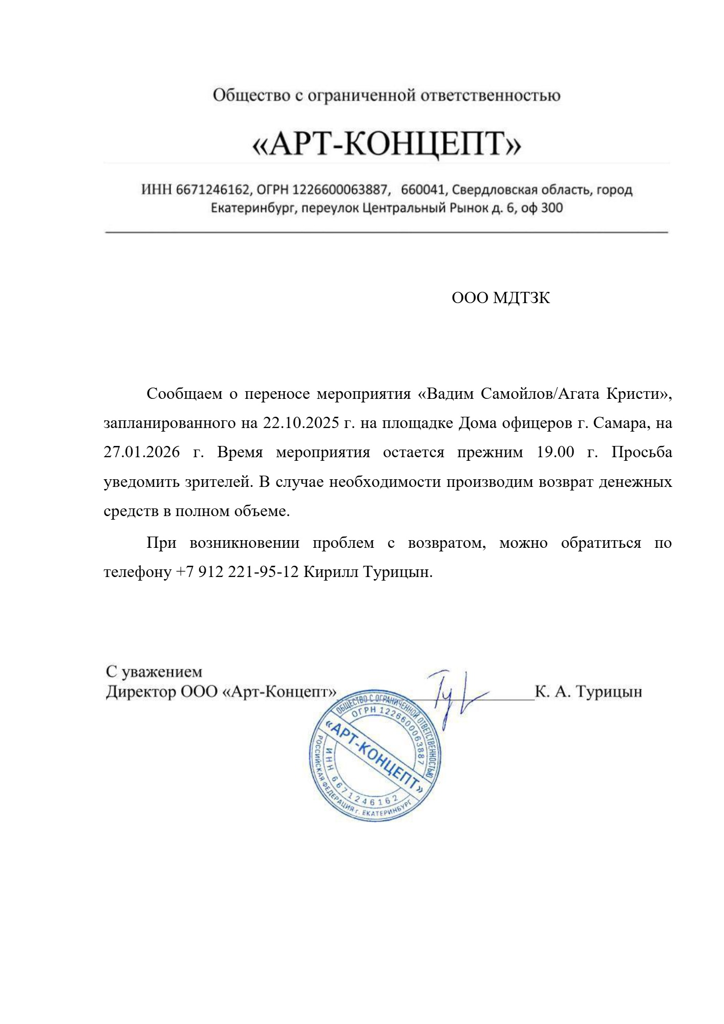 Уважаемый клиент! Спешим сообщить, что по информации, полученной от организатора, концерт «Вадим Самойлов. Группа «Агата Кристи», запланированный на 22 октября 2025 года в 19:00 в Окружном Доме Офицеров (Самара), перенесён на 27 января 2026 года, начало в 19:00. Ранее приобретенные билеты действительны на новую дату, обменивать их не нужно. Если вам не удобно посетить спектакль в новую дату, вы можете вернуть билет по кнопке в личном кабинете во вкладке «Заказы» (до 27.01.2026 19:00). Деньги за электронные билеты вернутся автоматически в полном объёме на карту, с которой была произведена оплата. Если вы купили билет в кассе Ticketland.ru за наличный расчет, то обратитесь, пожалуйста, на почту: vozvrat@ticketland.ru. С уважением, команда поддержки Ticketland.