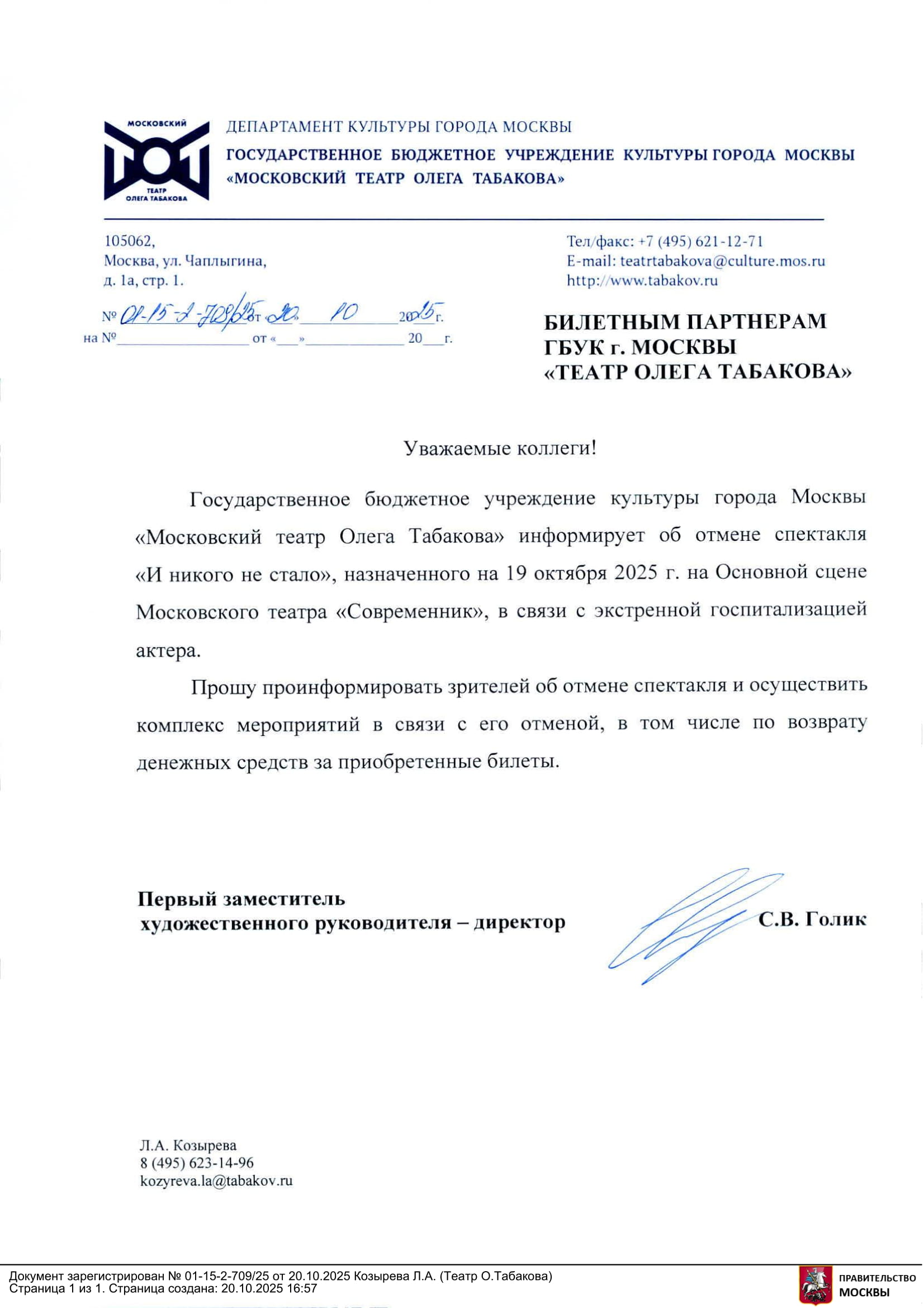 Уважаемый клиент! Спешим сообщить, что по информации, полученной от организатора, спектакль «И никого не стало», запланированный на 19 октября 2025 года в 19:00 в театре «Современник», отменён. Деньги за электронные билеты вернутся автоматически в полном объёме на карту, с которой была произведена оплата. Если вы купили билет в кассе Ticketland.ru за наличный расчет, то обратитесь, пожалуйста, на почту: vozvrat@ticketland.ru. С уважением, команда поддержки Ticketland.