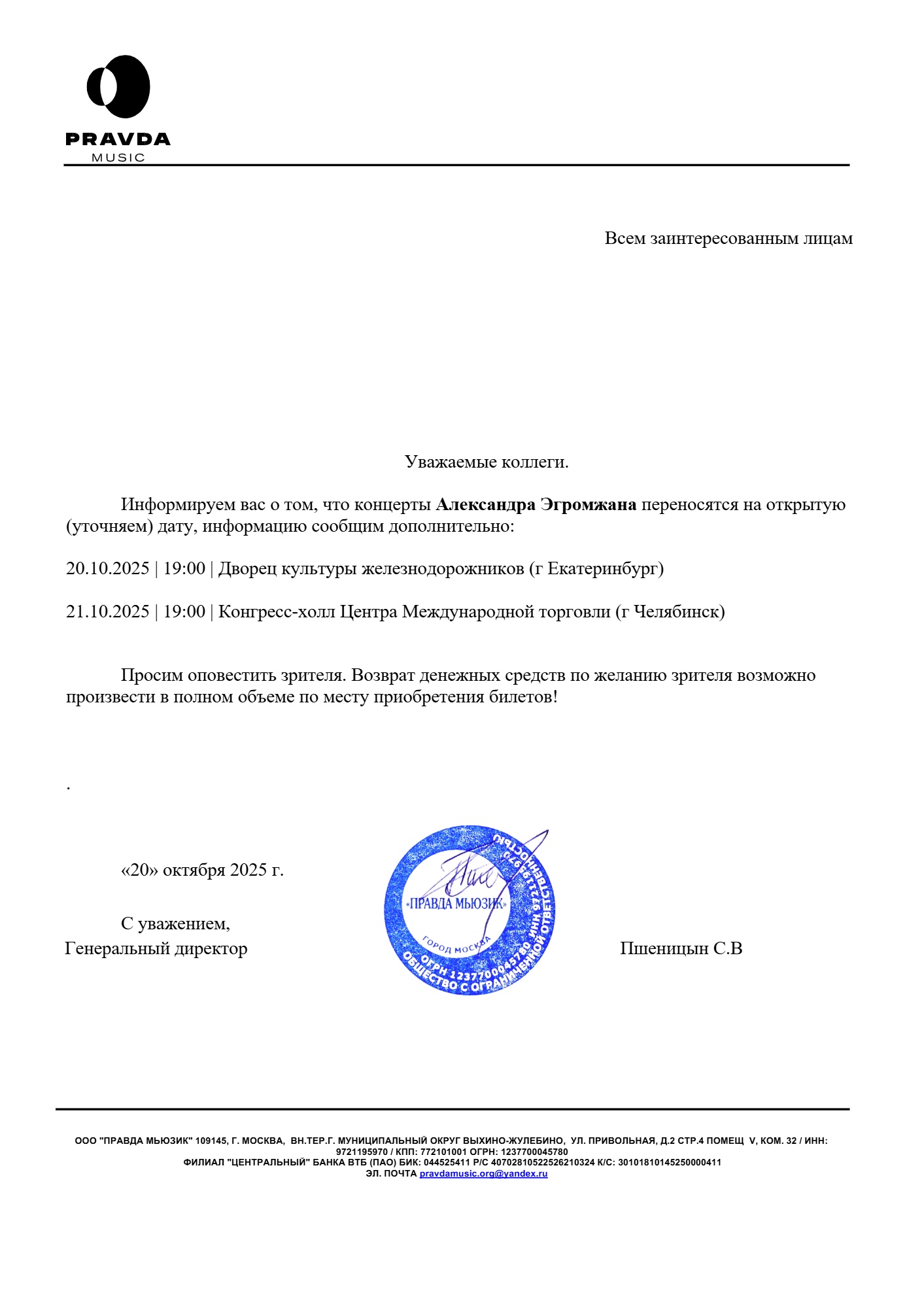 Уважаемый клиент! Спешим сообщить, что по информации, полученной от организатора, концерт Александра Эгромжана, запланированный на 20 октября 2025 года в 19:00 в ДКЖ (Екатеринбург), перенесён на открытую дату. Новая дата будет объявлена позднее. Ранее приобретенные билеты действительны на новую дату, обменивать их не нужно. Если вам не удобно посетить мероприятие, вы можете вернуть билет по кнопке в личном кабинете во вкладке «Заказы» (до 30.11.25 включительно). Деньги за электронные билеты вернутся автоматически в полном объёме на карту, с которой была произведена оплата. Если вы купили билет в кассе Ticketland.ru за наличный расчет, то обратитесь, пожалуйста, на почту: vozvrat@ticketland.ru. С уважением, команда поддержки Ticketland