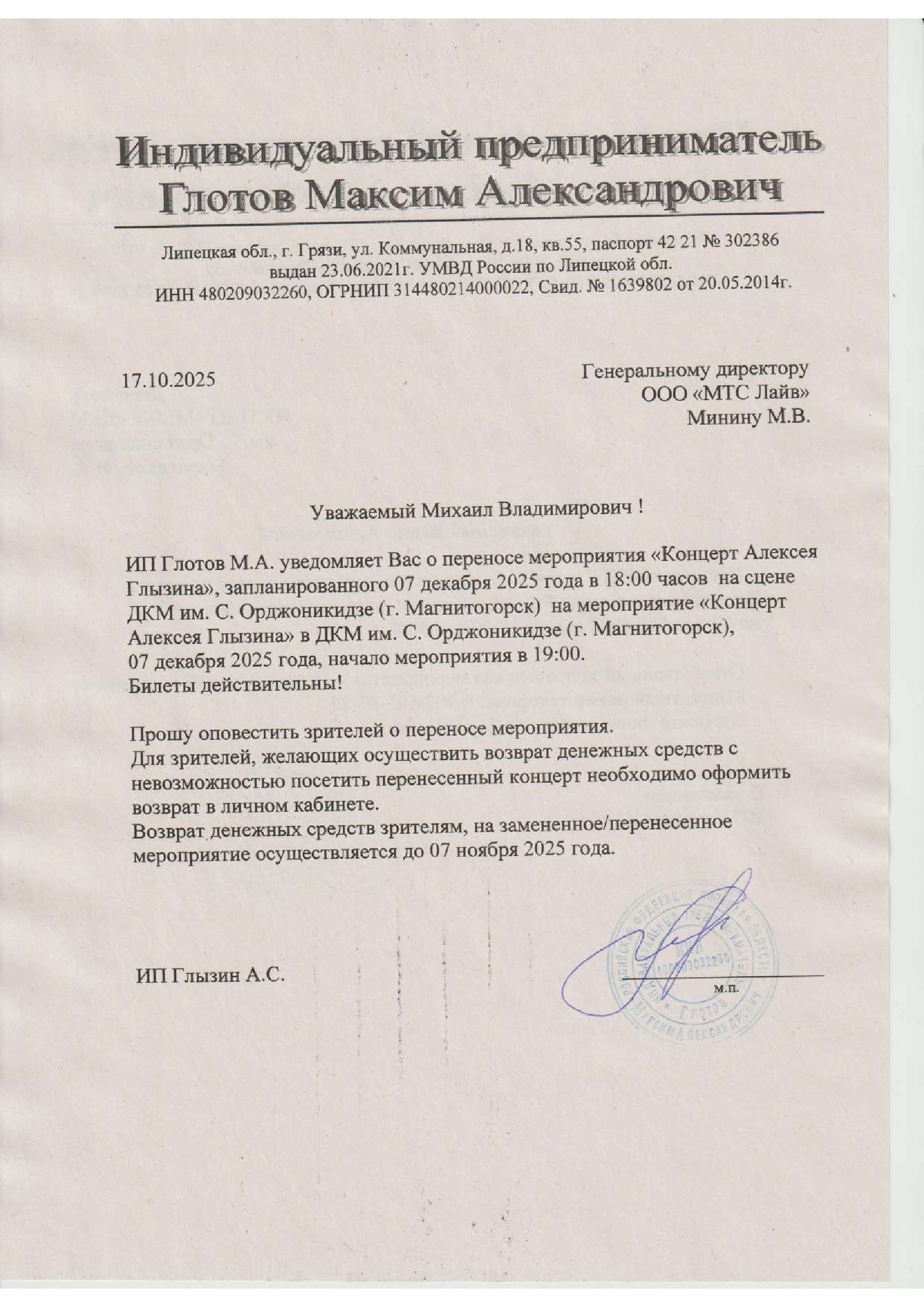 Уважаемый клиент! Спешим сообщить, что по информации, полученной от организатора, концерт Алексея Глызина, запланированный на 7 декабря 2025 года в 18:00 в ДК Орджоникидзе, перенесён на 19:00. Ранее приобретенные билеты действительны на новое время, обменивать их не нужно. Если новые условия вас не устраивают, вы можете вернуть билет по кнопке в личном кабинете во вкладке «Заказы» (до 7 ноября 2025 года). Деньги за электронные билеты вернутся автоматически в полном объёме на карту, с которой была произведена оплата. Если вы купили билет в кассе Ticketland.ru за наличный расчет, то обратитесь, пожалуйста, на почту: vozvrat@ticketland.ru. С уважением, команда поддержки Ticketland.